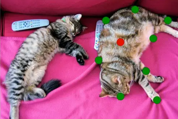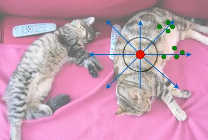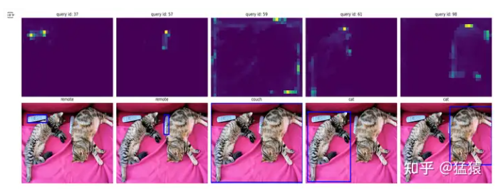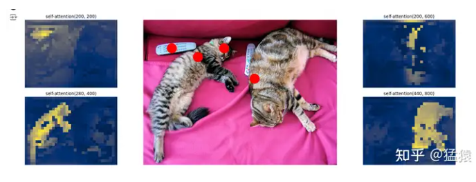 - Encoder的输入是特征图的某个像素点向量(又叫token),通过self-attention,得到其与other tokens的相似度(similarity),通俗理解就是,位于🐱头的token理应和位于🐱jio的token相似度高,而与狗头或者牛马等不相同类别的物体的token相似度低。由下图的attention map可见,encoder的某一个token遍历其他所有token(包括自己)来学习自己应该关注哪些tokens,不该关注哪些tokens。可以说encoder的目的是掌握全局信息,是一种粗理解。 - 如何可视化attention map: 计算出来的attention_weights有[H*W]个,reshape回 [H,W],然后再按照attention_weights去高亮每个像素点就会得到attention map