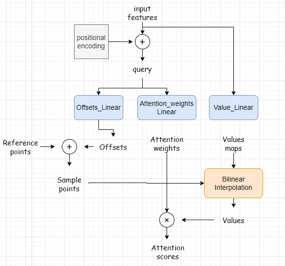 workflow如上图所示,input feature为backbone的输出,加上positional encoding之后变成query。这里设立三个FFN,其中一个通过input features生成value maps,其他两个通过query生成偏移以及attention weights(对的,此处的attention weights并不是通过$softmax(\frac{Q^TK}{\sqrt{d_k}})$计算得来)。reference points的实现源码稍后分析,总之根据reference points和offsets就可以得到sample points,然后通过插值的方法得到每个sample points的value(因为reference points很大可能是小数坐标),最后就可以得到attention scores了,忽略掉很多细节,看上去挺简单的。
