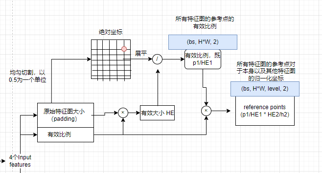 reference points初始化为对于每一张特征图,先按均匀分布在x和y方向切割,取其中心点。然后原始特征图大小乘上有效比例等于有效大小,然后中心点除以有效大小等于有效比例,既$p1/HE1$。最后在第1维concat,得到尺寸(bs, H*W, 2),表示所有特征图的reference points的有效比例。最后乘以valid_ratios,得到reference_points,尺寸为(bs, H *W, level, 2) , 表示对于所有特征图的reference points,其在该特征图以及其他特征图的归一化坐标。