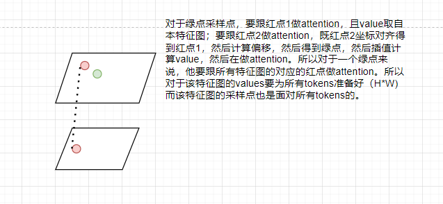 # 这是比较难理解的,一个token会坐标对齐找到其他特征图的tokens'的归一化坐标,然后该tokens'在做偏移,然后插值得到values,此时的token会跟该采样点做attention,用的就是这个values