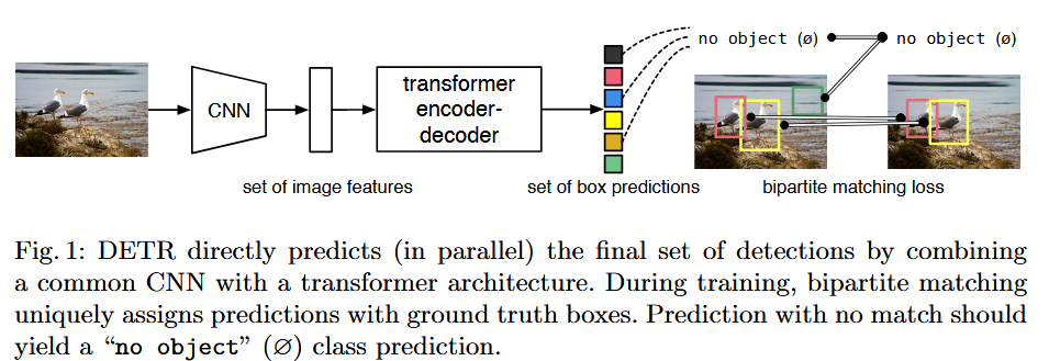 DETR使用二分图匹配,设计了一个loss,并且设计了object query的embedding控制生成预测的数目。将每一个预测的边界框(class,boxes)与唯一一个真实物体框相对应,通过这种方法DETR可以实现端到端的检测框架(什么含金量啊~~)。且DETR结合了当下最流行的transformer架构,自注意力机制能够使模型更全面了解到图像的上下文和全局关系,从而增强模型的检测效果。
