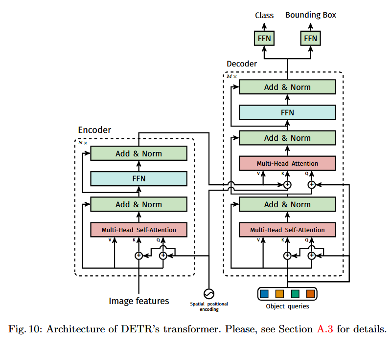 - decoder的第一层输入是object query,先去做自注意力操作,随后的cross attention中,Q为decoder的输出,并且加上object query;K为memory,并且加上positional encoding,V为memory。object query可以表示为不同的objects(因为一个object query表示一个检测框),此处的注意力机制可以注入不同object的相关性,再加入到图像特征中。