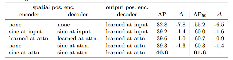 - 关于位置编码的消融: - 如果只使用object query,AP下降非常多